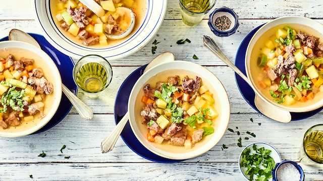 Web Vom Gemüse die gewünschte Menge wegnehmen und mit dem Fleisch in die Suppenteller geben. Die klassische Hühnersuppe ist gesund gibt Kraft auch bei.